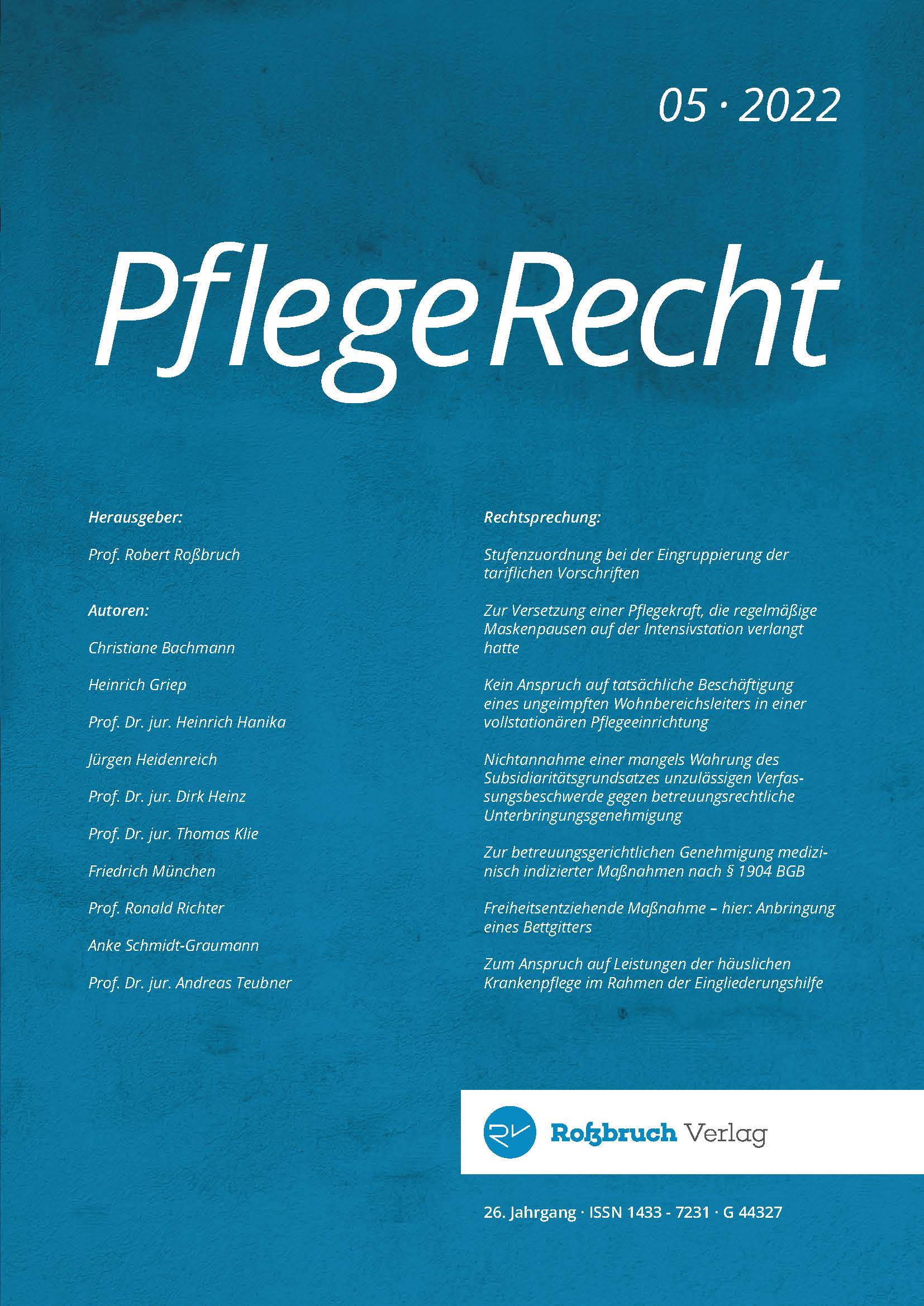 Die Fachzeitschrift PflegeRecht ist die auflagenstärkste monatlich erscheinende juristische Fachzeitschrift im Bereich Pflege. Zitiert vom Europäischen Gerichtshof (EuGH) sowie vom Bundesarbeitsgericht (BAG), dem Bundesgerichtshof (BGH), dem Bundessozialgericht (BSG) und dem Bundesverwaltungsgericht (BVerwG).